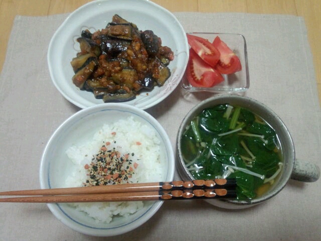 ★茄子の挽き肉味噌炒め&かぶの葉とエノキのスープ★